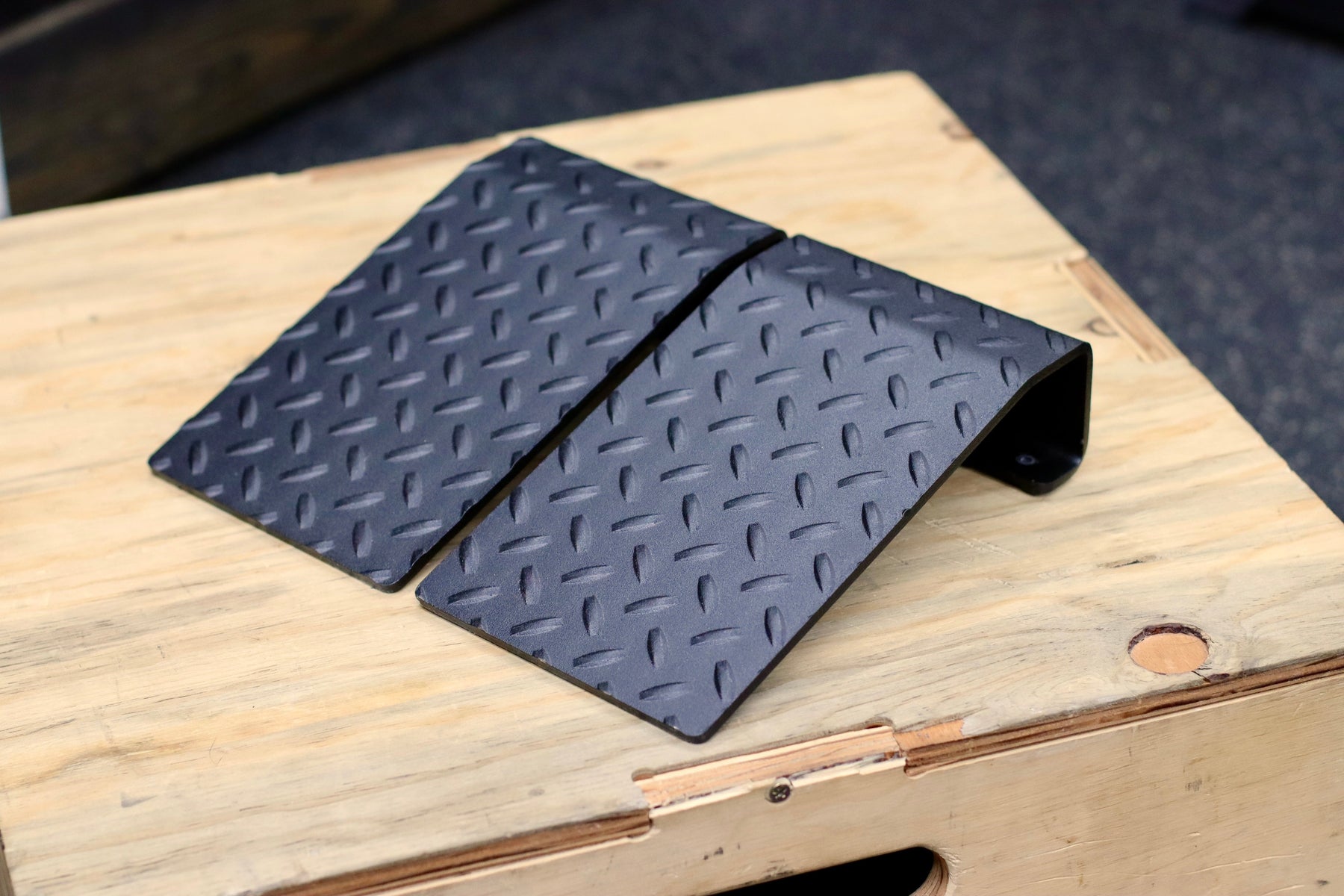 - Manufactured out of high strength 3/16" thick steel wedge with industrial grade, non-slip, steel diamond treadplate and textured powered coating, provides superior traction and a solid structure to withstand and deliver a secure footing while preforming heavier lifts while pre-assembled rubber bumpers keep the edges firmly in place.