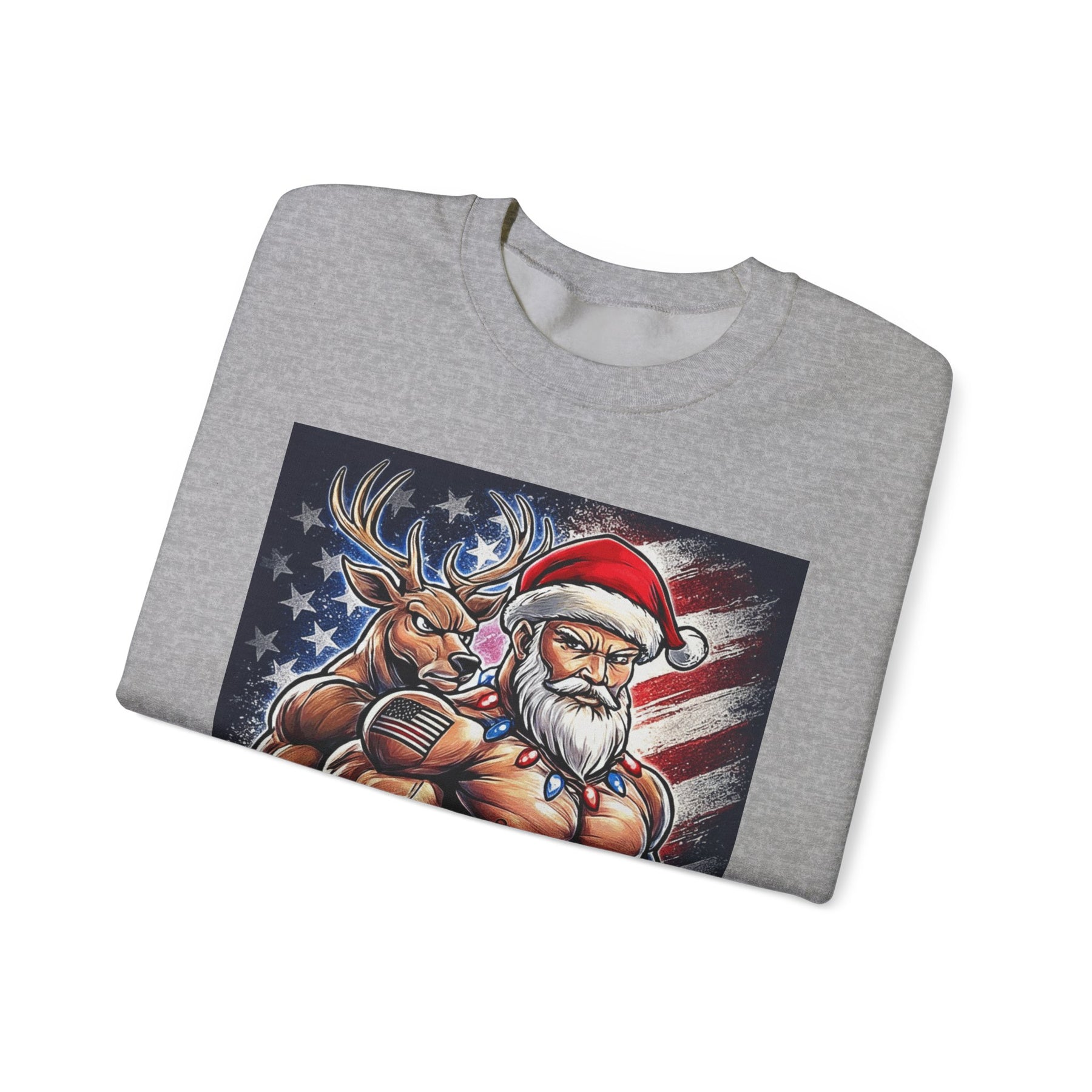 This crewneck brings bold holiday attitude to your cool-weather rotation. The soft, mid-weight 50/50 cotton–poly blend and classic crew silhouette feel familiar and comforting, while the striking front artwork — a muscular, gritty Santa and reindeer set against a waving American flag — makes a confident statement. Double-needle stitching and a ribbed knit collar hold up to repeated wear. It arrives with tear-away neck labeling for comfort and can be customized with embroidery on the chest or wrists for a personalized touch. Wear it for cozy nights by the fire, festive family photos, or as a standout layer at holiday gatherings.